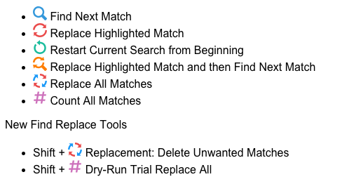 I recommend that the Replace All and Count All tooltips contain an indication of the quick shortcut (Shift+click) for alternative use with the new tool (although they will still be accessible via the "Search" menu and their custom shortcut which are a totally different system)