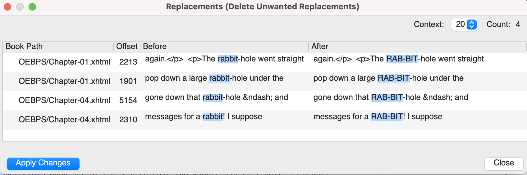 To conserve screen real-estate for those users still using lower resolution monitors and laptops, we redesigned the Find Replace dialog to minimize its width as that in turn determines the minimum width of CodeView and the resulting width of the main window. This involved moving the advanced Regex options into their own menu, replacing the text based buttons with universal icons, and re-ordering rows. In many languages the old text based buttons and advanced options names took up considerable and precious space. This change to use icons on buttons in turn freed up enough space to allow a new "Text" checkbox be added that when checked will limit the search to text outside of xhtml tags (one of our heavily requested features). See Attached: FindReplace-Dialog.png The screenshot above shows the new layout with the new Text checkbox. The next image shows how to access the Advanced Regex checkable menu options: See Attached: FindReplace-Adv-Options.png The meaning of each new icon is explained below. In addition, the way to launch two new additional FindReplace tools: "Dry-Run Replace All" and the "Filter Replacements" are also shown. Tooltips have been fully updated in case the user ever has any doubts. Filter Replacements (Delete Unwanted Matches) This tool helps users use Find and Replace All more effectively. It lists all of the matches found in context and shows their replacement in that same context. The amount of context both before and after a match (in characters) can be controlled by the user. See Attached: Filter Replacements.png If the user sees a match that is unwanted - i.e. they do not want that replacement to be made, they can select that match's row in the table and use the delete key or select delete on the pop-up menu to remove it. When all unwanted matches have been found and deleted, the user can then use the "Apply Changes" button to have just the changes remaining in the table made. This tool can by launched by Shift clicking on the Replace-All button. Dry-Run Replace All Often when crafting regular expression for Find and Replace, it is difficult to know if your find string will properly detect the cases you want while excluding the cases you do not want. This table shows the results of a trial dry-run of your current find and replace terms in context. No actual replacements/changes are ever made. Similar to the earlier dialog, the amount of context both before and after a match (in characters) can be controlled by the user. This tool can by launched by Shift clicking on the Count-All button. See Attached: Dry-Run-Replace-Dialog.png This allows the user to safely experiment with their search terms to see which if any would be most effective. Any row in the table can be double-clicked and the exact context for that particular match will be brought up in CodeView for the user to examine in more detail or to edit. This way a user can verify that a find replace all sequence will do exactly what they expect it to do. If the user makes changes to the underlying text that will impact the table, the user can click on the "Refresh" button at any time to force the table to be rebuilt. Notes Before anyone gets in an uproar over these changes, please note that these buttons are svg files that can be completely replaced and controlled by the user by using their own Sigil custom theme. This includes the ability to put back the buttons using text inside the svg for their chosen language. See Sigil IconThemes repo on GitHub for details on how to custom theme the icons used by Sigil. Versions of these icons suitable for those who prefer the fluent or material themes have already been made and included. Special Thanks A very special **Thank You** goes to our own BeckyEbook for designing and creating all of these new icons in versions suitable for main, fluent, and material themes and donating them to Sigil. Her many and varied contributions to Sigil has helped Sigil immensely and is greatly appreciated. Also a big "Thank You" goes to our own Doitsu for all of his testing and feedback of these interface changes. Last edited by KevinH; 05-05-2022 at 10:44 AM. Reason: minor fixups |