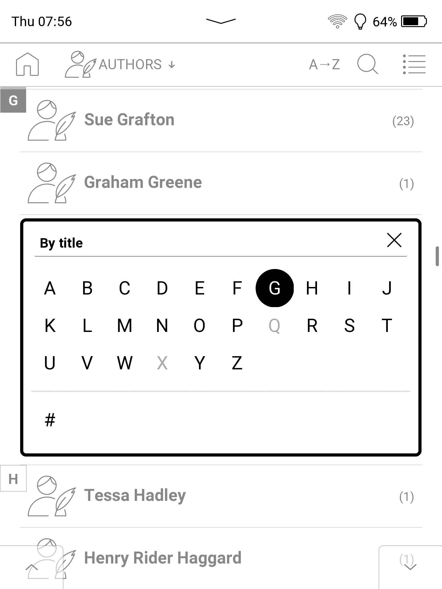 A long press on any book (no matter if it is ordered by date, genre, series, author...) gives you the option to access all the books of the author or series (and to open with any reading program installed: PBReader (epub 3), PBReader (epub 2), KOReader and CoolReader). |