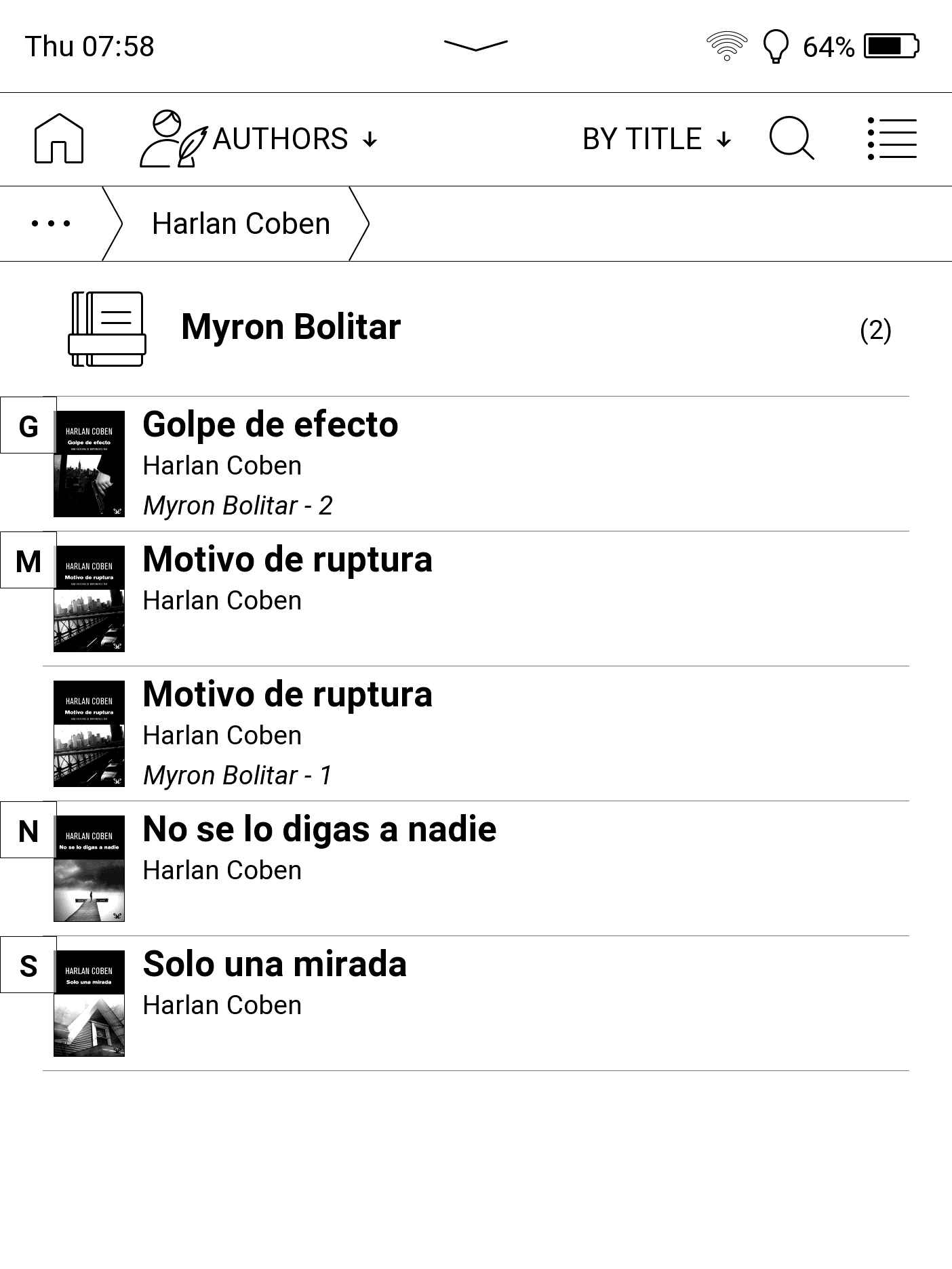 A long press on any book (no matter if it is ordered by date, genre, series, author...) gives you the option to access all the books of the author or series (and to open with any reading program installed: PBReader (epub 3), PBReader (epub 2), KOReader and CoolReader). |