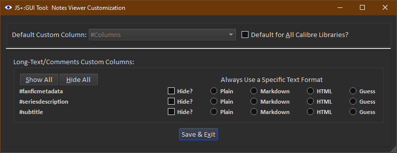 Not on my system. I created a new long-text custom column, restarted, ran NV, then selected the new column in the dropdown. It was there because there was nothing in the saved options about it, of course. I then clicked 'options'. It was there, along with all of my other customization options. What did you do differently? Added: the only possible way is if you did not restart Calibre immediately after adding a new column, but rather ran NV instead. DaltonST Last edited by DaltonST; 03-24-2023 at 04:06 PM. Reason: added comments. |