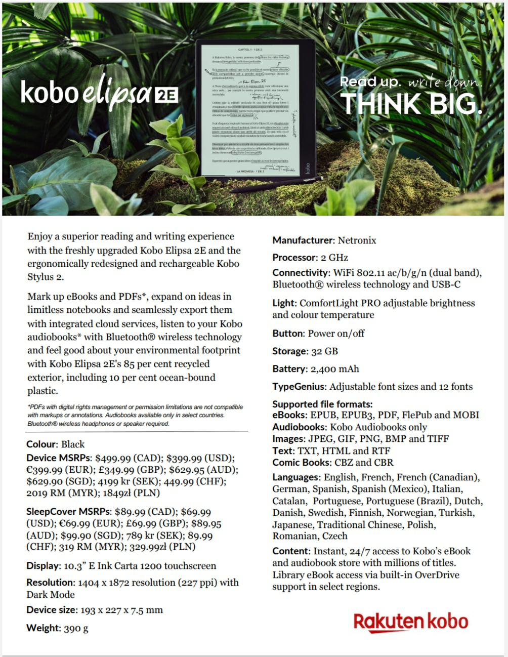 For Canadians, the Kobo Elipsa 2E is now available for pre-order at Indigo.ca, with the same $25 Kobo gift-card thrown in that you'd get by ordering direct from Kobo Canada. The advantage of buying through Indigo is that returns are much easier, in that you can take online Indigo purchases back to any Indigo or Chapters bookstore (or, of course, return by mail if you wish) without hassling with a return-merchandise authorization from Kobo.