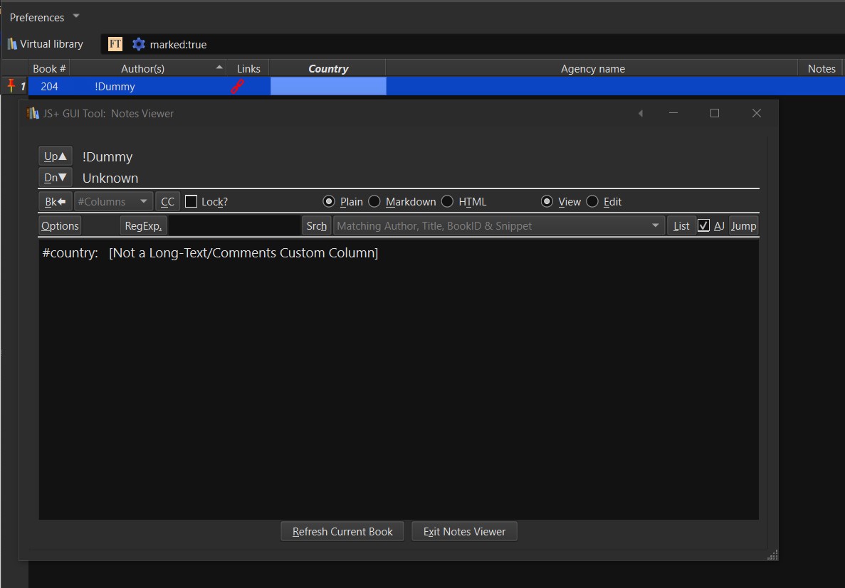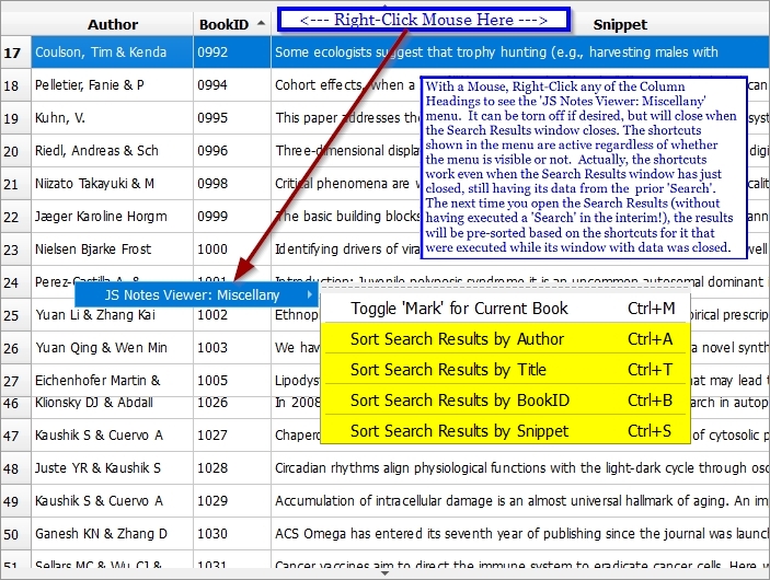 Thanks for the changes. Sorting on BookID should be numeric, see attachment (note the Snippet - maybe it should be first two lines if first is very short - without the line feed). I'd also prefer to set and forget a default Sort sequence - for me it would be BookID ascending. Ditto with AJ - which for me would be checked. ![]() The RegExp field doesn't appear to have a 'Alt+' shortcut The following error can also occur if the user does a NV search and then does a book list search that takes NV search results out of sight. You might want to add " or you did library search, or clicked a VL tab". I hit Alt+A in the book list which does a search for current author ![]() Quote:
