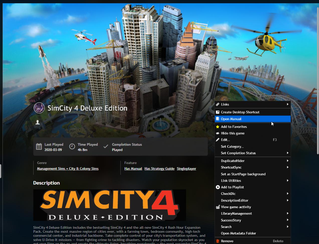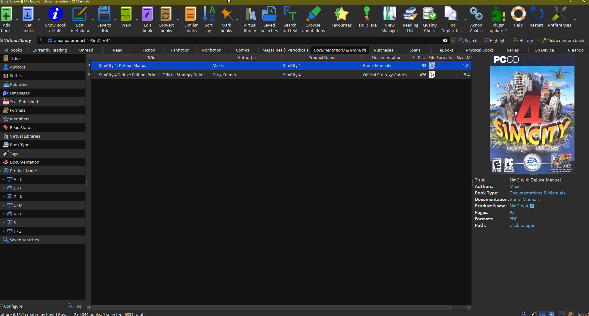 I do use the links a lot though. For example, I set up Playnite's 'show manual' menu entry. A show-book if there's only one, or search if there's multiple items. Clicking this one opens a search. If there's multiple items its most commonly a manual and strategy guide*: Then the 'Product Name' links jump back to the relevant game entries in the game launcher. (Well, except the first SimCity.) This is useful for jumping to my game docs, opening the one(s) I want, and then jumping back to the game launcher. *I hoard Prima Game Guides