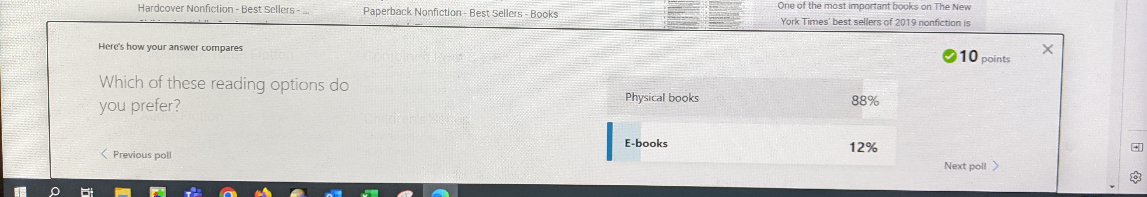 If ebooks had been the top choice, the answer would have been very different. The top choice generally runs at 80% or more. People don't bother to answer seriously; they're just collecting their points. All this shows is maybe a 10% swing in favor of paper.
