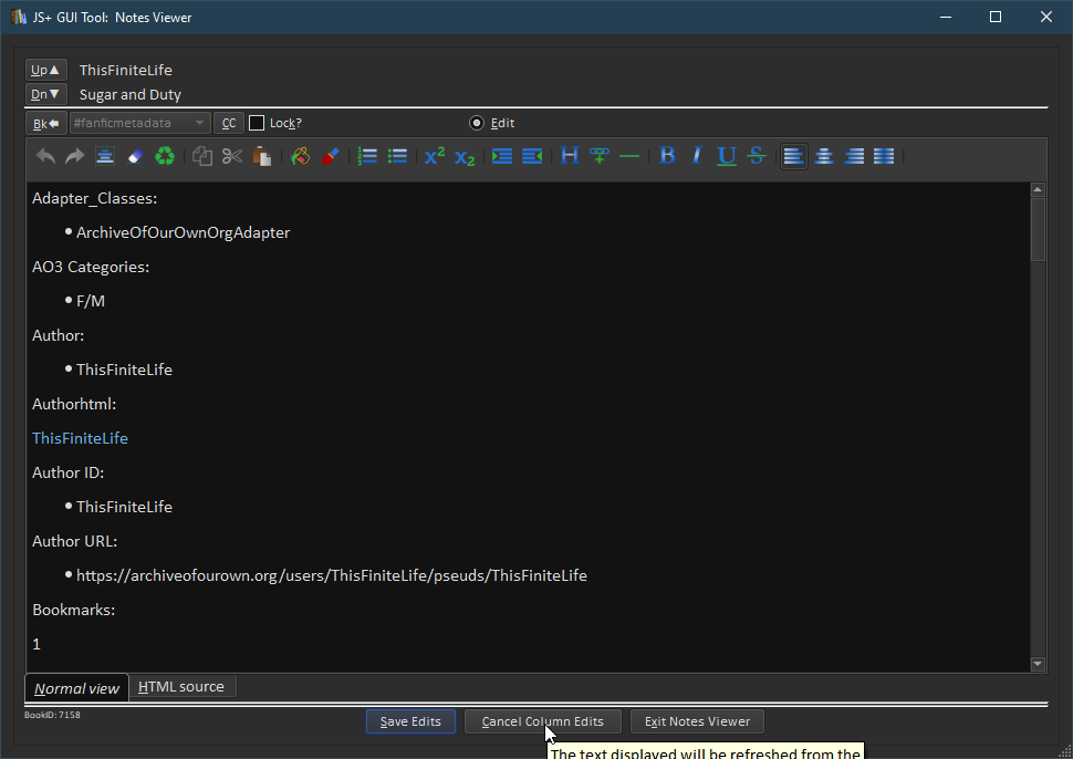 Version 1.0.232 -2023-04-13 Notes Viewer: Added the Name of the Source of the Sort Value after "Sort Value" in the Sort Value Column in the Search Results list. Add current BookID in lower left of NV window. New full HTML Editor. The "To HTML" (previously "HTML") button now converts Plain Text to basic HTML, and Markdown Text to its full HTML equivalent. Shortcuts and Context Menus now broadened in their ability to be triggered, and their responsiveness when triggered has been improved.