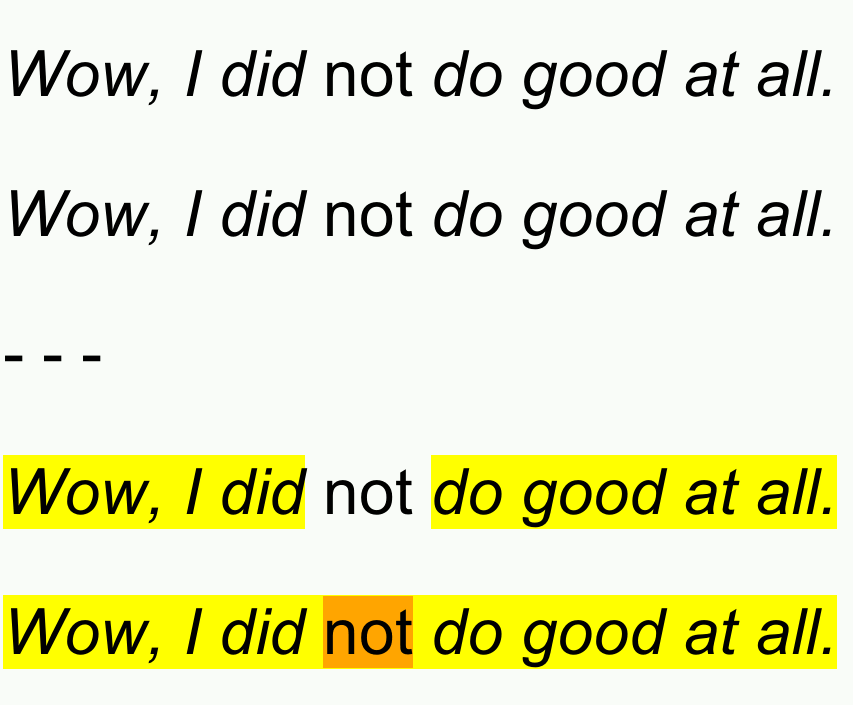 <p><i>Wow, I did</i> not <i>do good at all.</i></p> <p><i>Wow, I did <em>not</em> do good at all.</i></p> The 2nd is the type of HTML you would ultimately aim for: