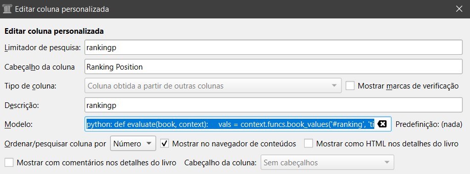 python: def evaluate(book, context): context.db.new_api.get_custom_book_data('#ranking' ) vals = sorted([float(v) for v in vals], reverse=True) return str(1 + vals.index(float(book.get('#ranking')))) |