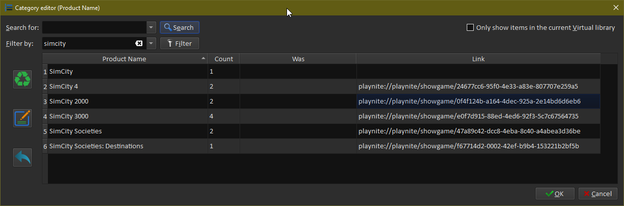 I do use the links a lot though. For example, I set up Playnite's 'show manual' menu entry. A show-book if there's only one, or search if there's multiple items. Clicking this one opens a search. If there's multiple items its most commonly a manual and strategy guide*: Then the 'Product Name' links jump back to the relevant game entries in the game launcher. (Well, except the first SimCity.) This is useful for jumping to my game docs, opening the one(s) I want, and then jumping back to the game launcher. *I hoard Prima Game Guides