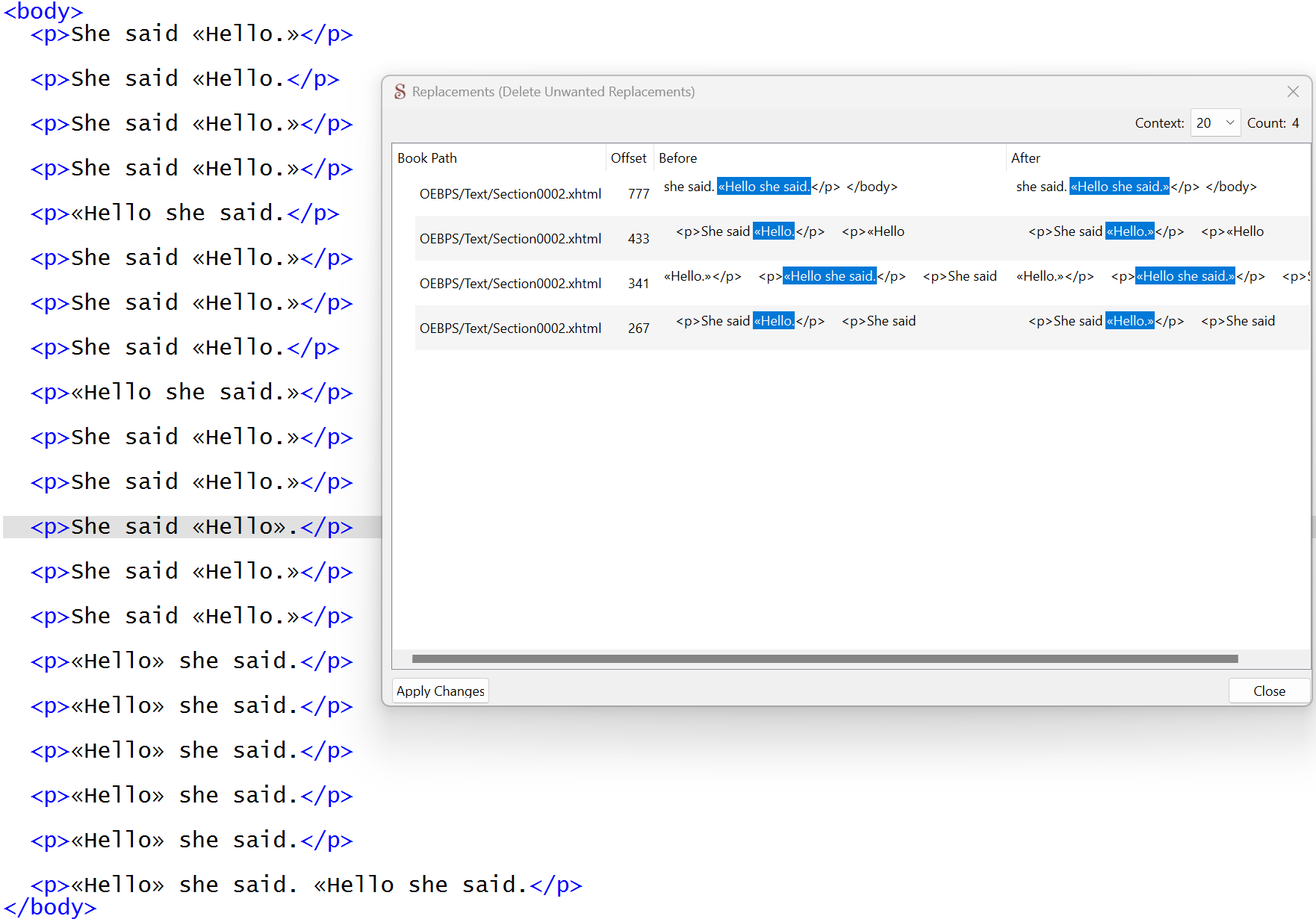 «(.[^»]*?)(?=</p>) You are correct that the «\1» would place guillemets around the entire captured text, but this process was never intended to be completely automatic. There is no way for the Find/Replace to discern what is dialogue and what is not. If you use the "Replacements (Delete Unwanted Replacements)" table (see attached image) you would quickly be able to see which sections have an opening « with no closing » highlighted - with what it would look like After the replace. As KevinH mentioned above, you could quickly remove any lines that didn't match the change you wanted...apply changes...then run the find again with a different replace criteria. ie. the above would not find "<p>«Hello she said. «Hello she said.»</p>" until you ran a different Find with the « in place of the look ahead </p> Like: «(.[^»</p>]*?)« That would probably be the fastest (least # of iterations) way to search through the text to find those types of errors. Last edited by Turtle91; 04-24-2023 at 11:08 PM. |