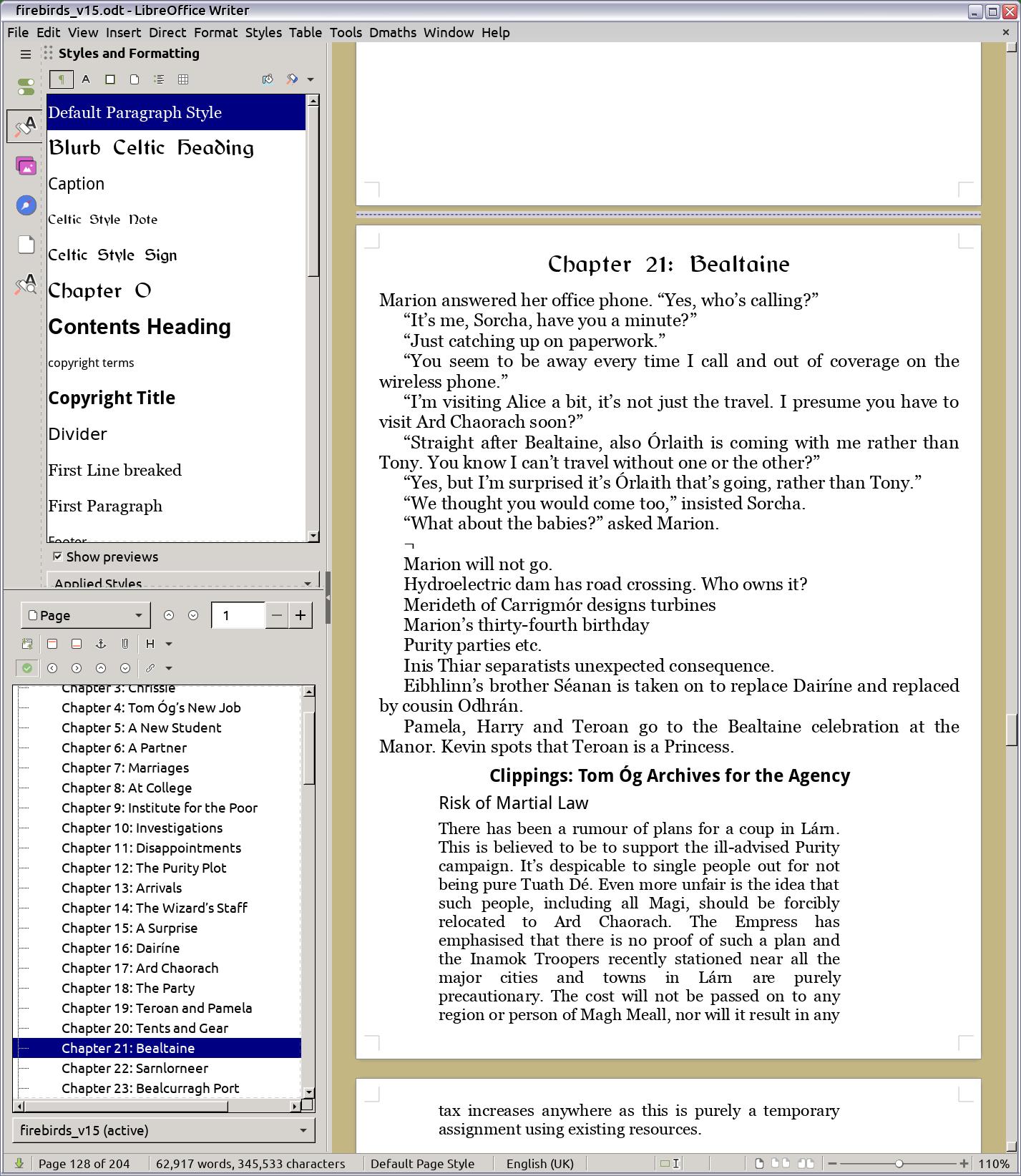 I once only ever in all the years (since XP Calibre) got a file per paragraph because the epub had a <p class="chapter"> tag at the start of every paragraph! Easily fixed either by editing Structure Detection command and re-converting original or global <p class="chapter" to <p class="p-body" in the editor. Do be sure to use styles in LO Writer and never* direct formatting. I have the Outline browser and Style Browser open either floating (6.x) or docked (7.x) I proof epub version first and only when polished save an extra copy with a new name for PDF with header, footer, page numbers and different page styles for Front matter, Start of Chapter, Left Page, Right Page and End Matter in exact size required for paper. Content changes only on the version for epub and I use a 420 pt wide 560 pt high page style. Epub: Use "pt" and all epub renderers should render 12pt = 1em PDF: Use mm or inches. Change the default substitution as you type rules. Add real name or pen name in Tools Options so location last used is position when you open, using odt format only. Only edit/save in odt. Do extra Save As for docx and don't edit it. PDF export is perfect. Don't use same file for epub and PDF. [* You can apply character Styles if really wanted for Em and Strong, but direct format of italics, bold (avoid, have as style in headings), superscript and subscript will map to HTML. Styles of all kinds (except page) map to CSS exactly. Page styles have no meaning for epub creation, but best to have all pages the same "default" style with no headings, footers or page numbers.] Last edited by Quoth; 05-13-2023 at 07:12 AM. |