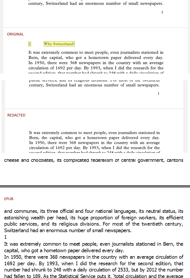 The only thing I'd need to get a near perfect EPUB is removing headers and footers… which is the perfect occasion to dig and understand why people bother with regex in the HTML at all if you can just remove the data from the source PDF before running Calibre. There's got to be a way to either remove everything that's outside the mediabox, or mark some sections as redaction annotions and remove them all. |