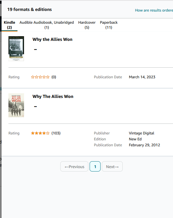 I just paid $10 for the Kindle version of Why the Allies Won by Richard Overy. On my Kindle ereaders (a Scribe and Oasis), the book is apparently just a series of imaged pages that cannot be resized. Adjusting font size, margins, etc. has no effect, and the entire page is displayed at once, making the font so small it's unreadable, especially on the Oasis. The Kobo version of the same work is $20, so perhaps Amazon is selling it for less because of the format. The Amazon website says the book has enhanced font setting, but if I change the font, font size or anything else, the screen just blinks and the page reappears with no change. What is going on? I have never encountered this with a book I bought from Amazon.