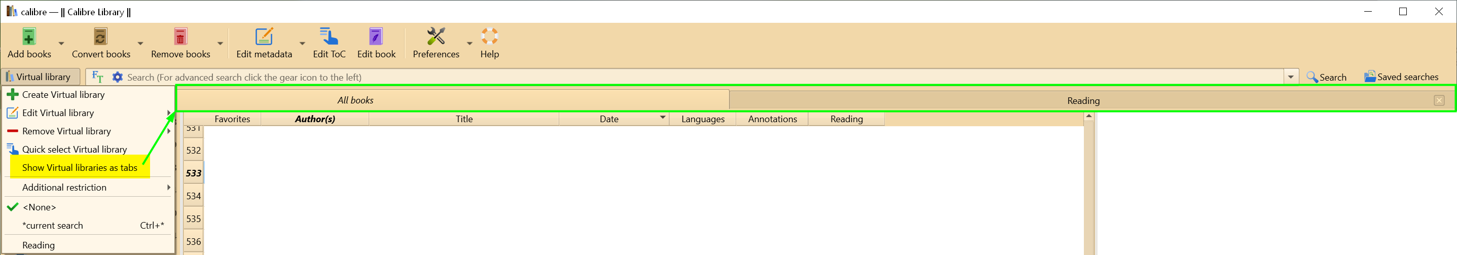 I have created the VL with a bad search :-( I used just "#reading", but you showed me I should have used "#reading:true" which finally did the trick. (reading being the lookup for the column) I really like this VL as tabs idea. I may use it for my 2read or favorites as well. It's very fast to navigate. Definitely will explore more. Best regards ![]() P |