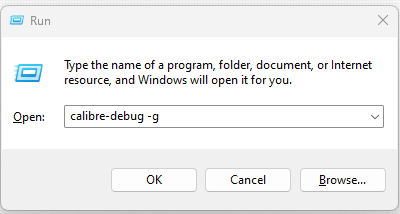 When you held down the Windows key on your keyboard and pressed the R key, did a popup box like the attached image show up? If so, did you type 'calibre-debug -g' (without the quotes) in the open box and hit enter or clicked on OK?