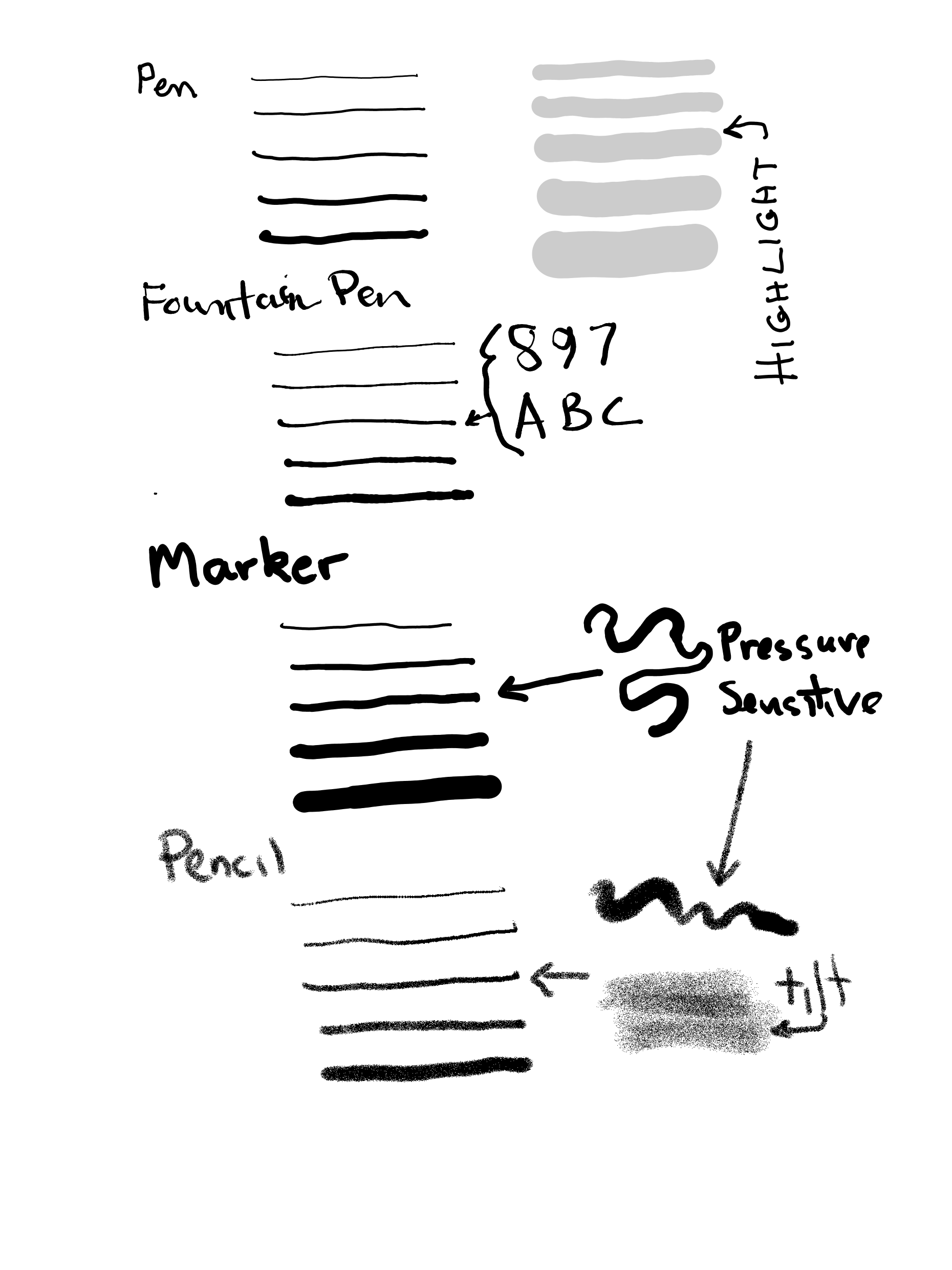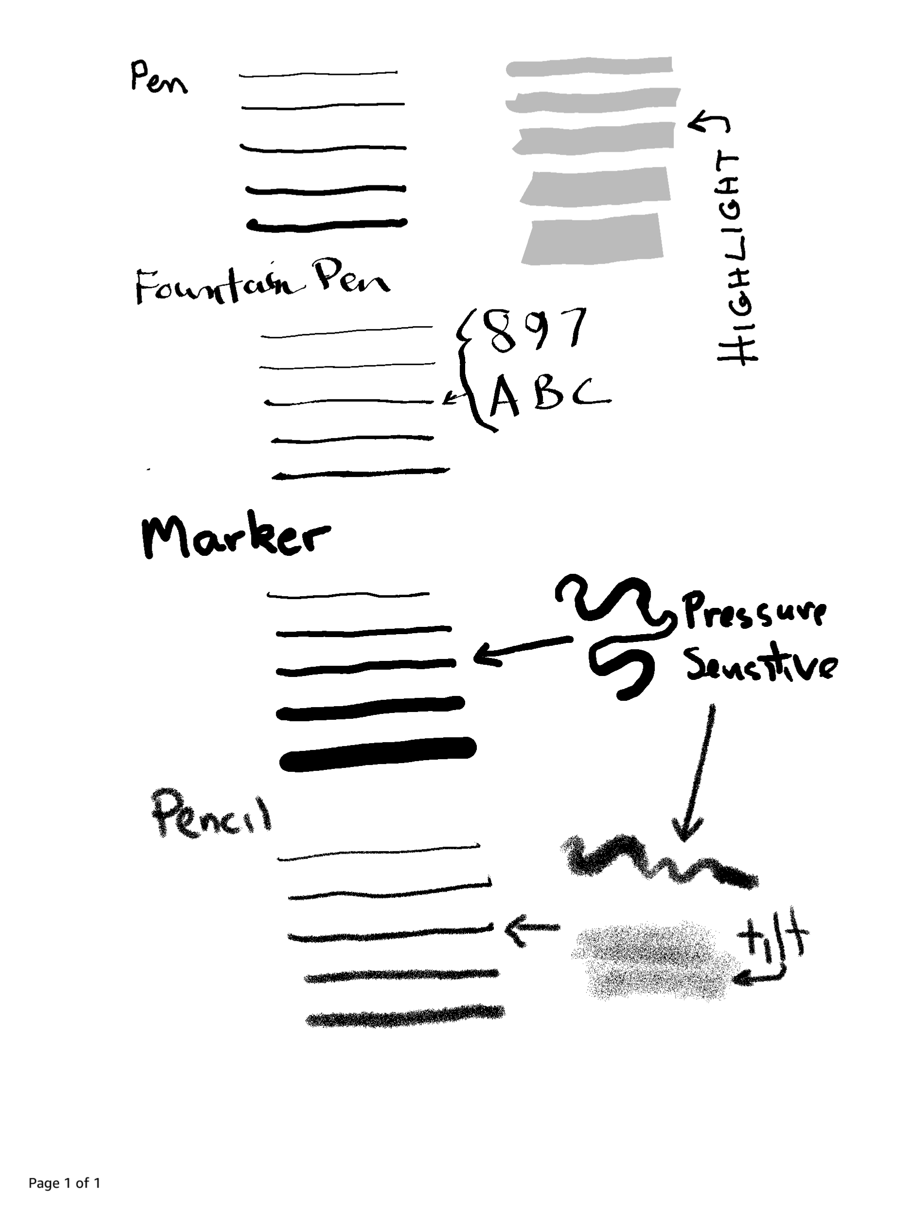 One thing that would help to complete it is a notebook with an example of each possible thickness for each brush type. Something line one page per brush type with a stroke of each thickness drawn on it. Another thing I saw in the latest Scribe firmware release was a mention of three stroke colors: light, dark, and black. I don't know how these are selected in the user interface but it would be good to have examples of those also. |