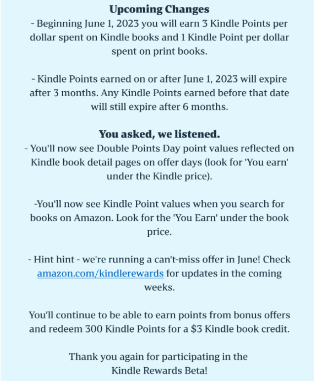 Looks like Amazon is changing the rules.  Now you only get 3 points for every dollar spent on a Kindle book.  It used to be 5 points.  So, if you want to get that whopping $3 off a future book you need to spend $100 rather than the previous $60.