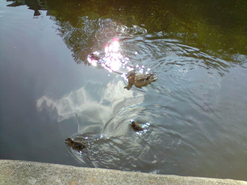 so, to make up for not taking more pictures at the apéro, here are some photos of.... DUCKLINGS !!!!! which i saw today on the canal. there were two families, one with 4 ducklings, and one with TEN tiny tiny fluffy fuzzy little baby ducklings !!!! bouh, so cute ! they were all swimming around the canal with the mama ducks, playing and eating, and the papa ducks were keeping watch nearby (or, more likely, talking about sports and wondering what was for dinner). |