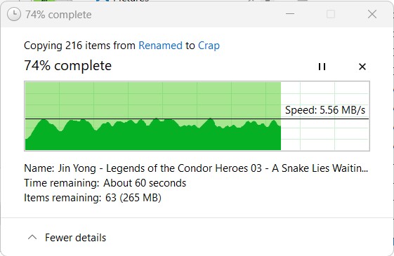 This is copying about 1GB worth of random eBooks to my Libra 2 from SSD to the Libra 2 via USB-C to USB-C in Windows 11 using Windows Explorer. I'm getting about 3M to about 6MB.