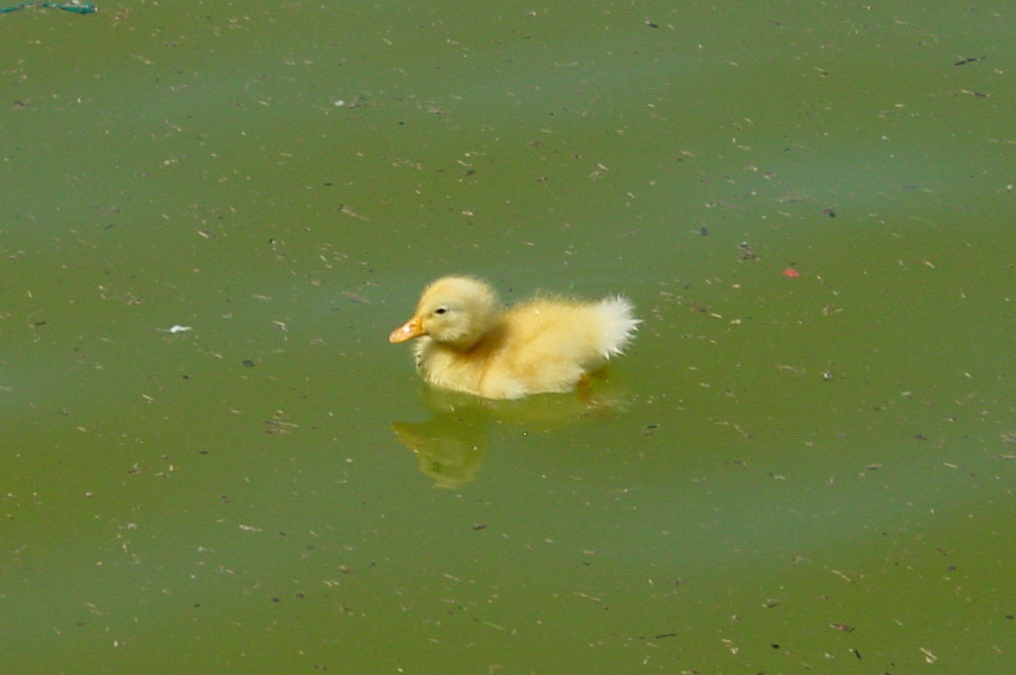 These "quackers" live at the our small neighborhood lake. Sometimes the little yellowish quacklettes wander off by themselves, as this one did. I guess they're more independent from the get-go, or they just get lost easily. After checking with the local feed store a few years ago, I've been feeding the ducks "cracked corn." They really like it. It stays on top of the water for a bit before sinking, and as it sinks, they just bob for it. I often just place a fistful on the ground for them when they're out of the water just walking around. You'd fit in with your quackin' cousins just fine here, daffy. |