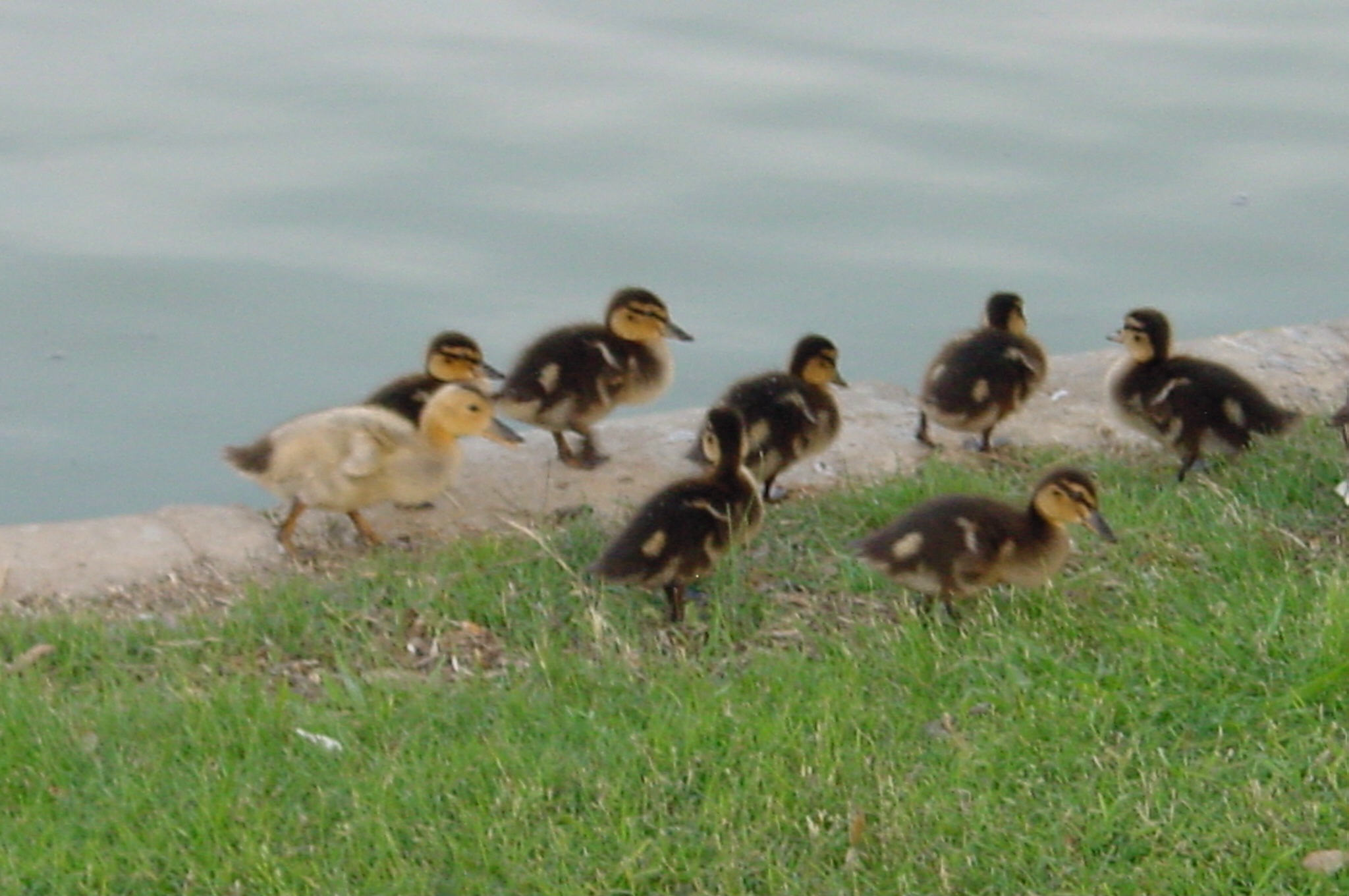 These "quackers" live at the our small neighborhood lake. Sometimes the little yellowish quacklettes wander off by themselves, as this one did. I guess they're more independent from the get-go, or they just get lost easily. After checking with the local feed store a few years ago, I've been feeding the ducks "cracked corn." They really like it. It stays on top of the water for a bit before sinking, and as it sinks, they just bob for it. I often just place a fistful on the ground for them when they're out of the water just walking around. You'd fit in with your quackin' cousins just fine here, daffy. |