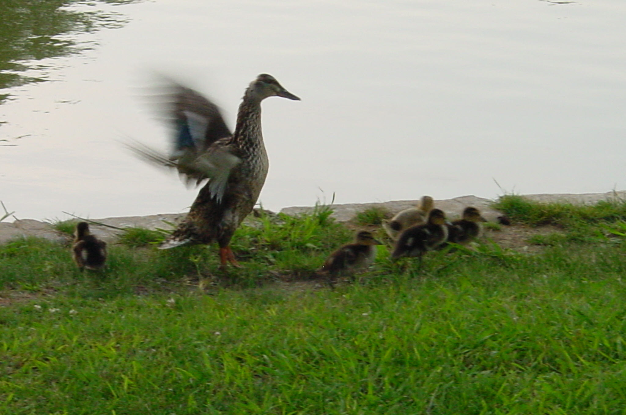 These "quackers" live at the our small neighborhood lake. Sometimes the little yellowish quacklettes wander off by themselves, as this one did. I guess they're more independent from the get-go, or they just get lost easily. After checking with the local feed store a few years ago, I've been feeding the ducks "cracked corn." They really like it. It stays on top of the water for a bit before sinking, and as it sinks, they just bob for it. I often just place a fistful on the ground for them when they're out of the water just walking around. You'd fit in with your quackin' cousins just fine here, daffy. |