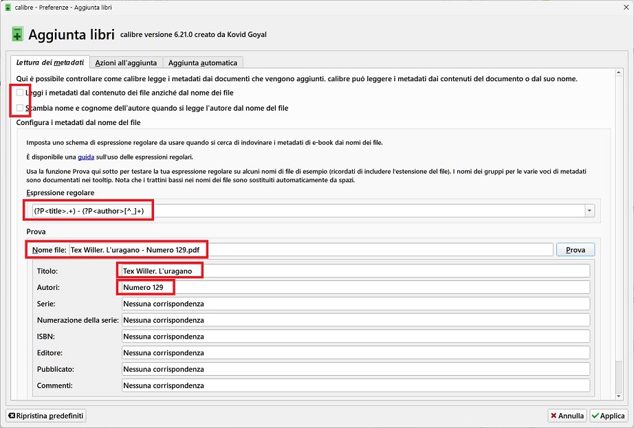 @gianni_1 - the regular expression field is irrelevant if the Read metadata from file contents rather than file name option is checked. When that option is checked the metadata (author, title, publisher, publication date etc) that is embedded in the book will be used.
