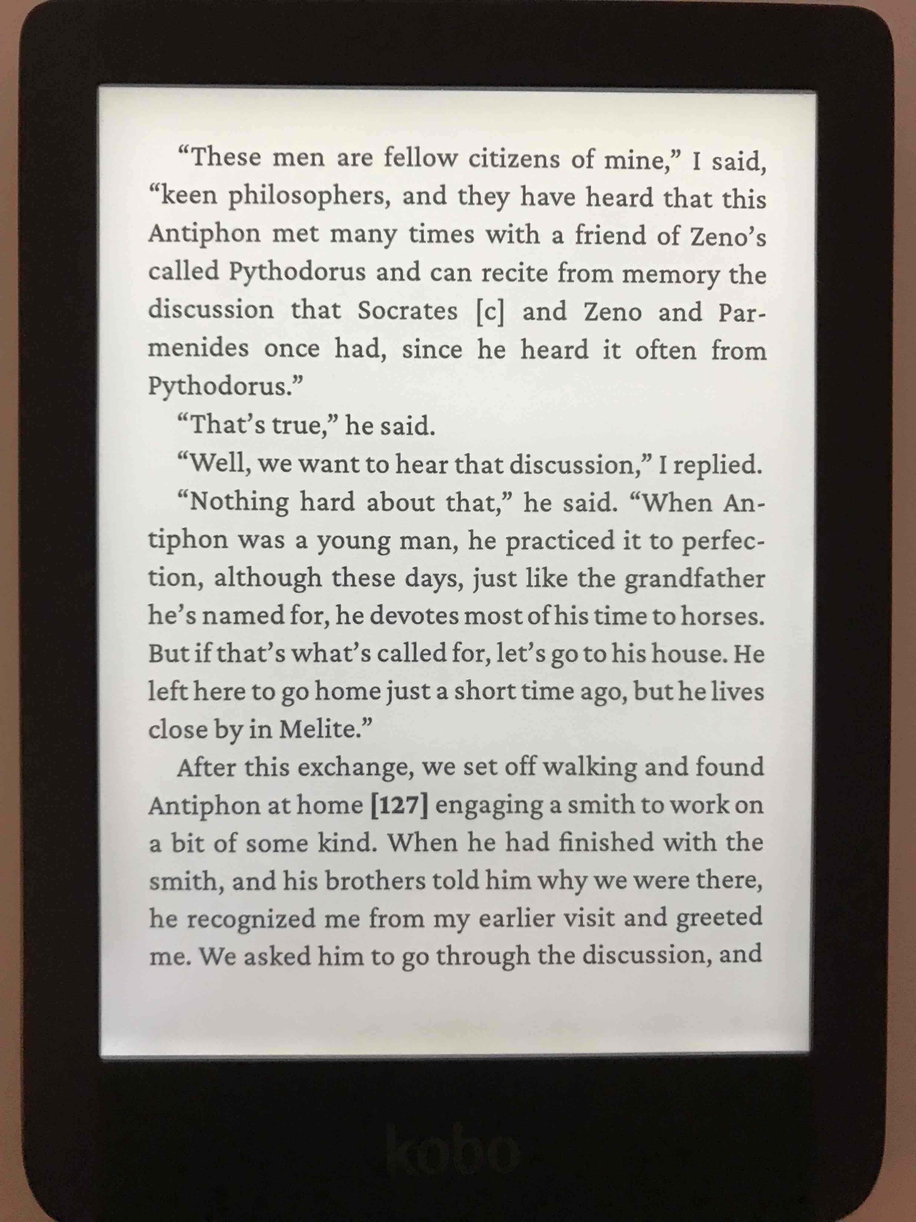 I do like fonts though, so I do check different ones out from time to time. On my Nook, I like Georgia. But I remembered thinking Georgia didn't look as good on Kobo, which is how I found Literata Book in the first place. Someone (edit: strangelove42) posted a screenshot of a Kobo with Georgia and it looks pretty good. Maybe I'll give it another go. |