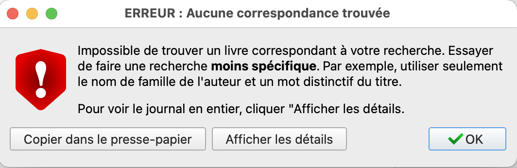 • Pour les auteurs, c'est parfait Voici les métadonnées d'un des bouquins de la série: ![]() • Pour la recherche des métadonnées, voici ce que je reçois, alors que les données présentes sont dans les formes : ![]() J'en déduis que je ne dois garder que les données des rubriques Ids (ne pas oublier "isbn:" et pour le titre Einstein. Ce serait mieux, si il existait un formulaire pour la recherche des métadonnées, parce qu'ici, ça commence par un processus destructif. Je vais donc détruire mes données actuelles et prier que Calibre ne me donne pas la même réponse. Je n'ai qu'une tête, et si je dois la taper contre le mur …