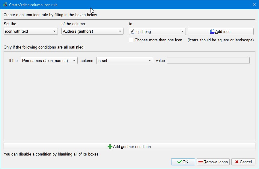You will probably need to find/download the icon you want to use. Download it from one of the many free icon web sites, then add it to calibre using the Add icon button. Best is a square PNG file 128 x 128 pixels. If the icon image is larger it will be resized to 128 x 128. The screen capture shows what I did. I chose to put the icon on the author's column. Of course you can choose whichever column you want. |