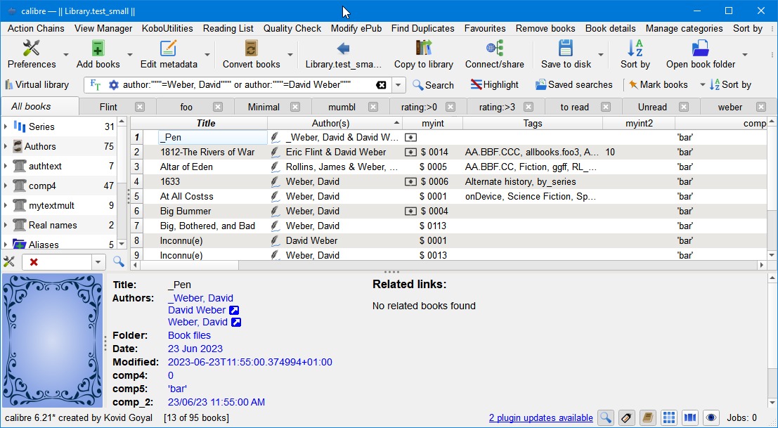 You mention a "search to concatenated pen-names" in your authors entry. I assume this is text for a search for all the items (pen names) that you manually maintain, ignoring any multiple-library differences. I wondered if there was a way to eliminate this manual maintenance, and if this "way" could work for any column, not just authors. To that end I modified the action chain script from a few posts up to work on a column/cell basis. When run, the script determines the column of the current selected cell (authors, publisher, series, custom columns, ???), finds all the values in that column with the same link as the items in the current cell, then generates a search for those values. It should generate the same search as you maintain in your authors entry but without the manual maintenance. To use it, import the action into action chains and give the new action a keyboard shortcut. When you want to do the search, select the desired cell (mouse, keyboard) then activate the shortcut. It will generate and execute the search. If there is a problem then it puts the error text in the search bar. NB: this action chain doesn't require using multiple libraries. The only requirement is that if items are related then their item link fields contain the same value. Probably the most useful values are calibre links to show a book or open a book details window, but it could be an external link. For example, it will work with @jecilop's scheme if the pen names link fields contain a link the the "_Pen" book for the real name. |