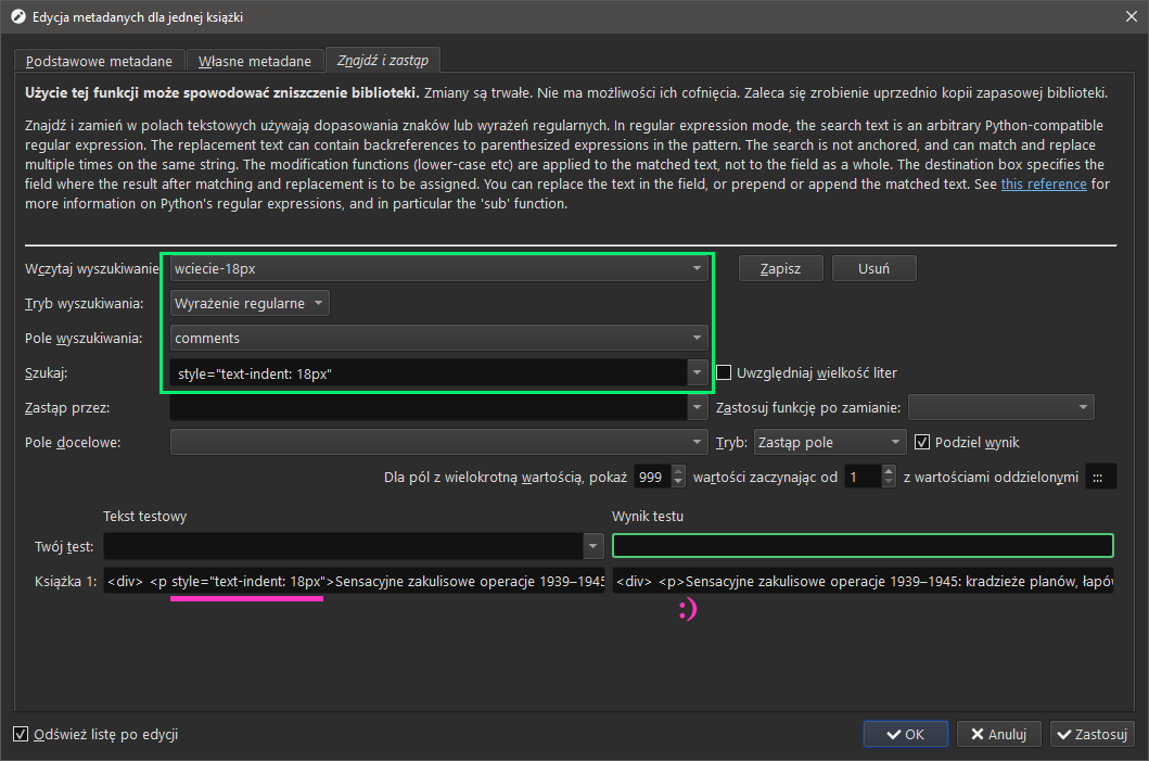 ..... <p id="strony">Książka ma 416 stron.</p> <p id="ratingLC">Ocena w LC: 6.55</p> <p id="ratingLC_count">Liczba ocen w LC: 2465</p></div> Jednak nie wszystkie komentarze zostały pozbawione style="text-indent: 18px" (zupełnie nie wiem dlaczego) Czy masz może pomysł jak taśmowo pozbyć się tej właściwości? Próbowałem skorzystać z narzędzia 'Znajdź i zastąp' w masowej edycji metadanych, ale niestety nic mądrego nie wymyśliłem