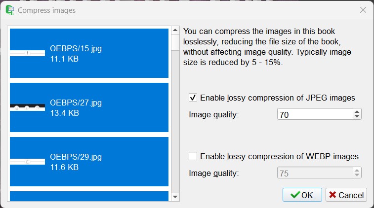 Then when that's done, go to Tools > Compress images losslessly, check Enable lossy compression of JPEG images and set the value to 70.