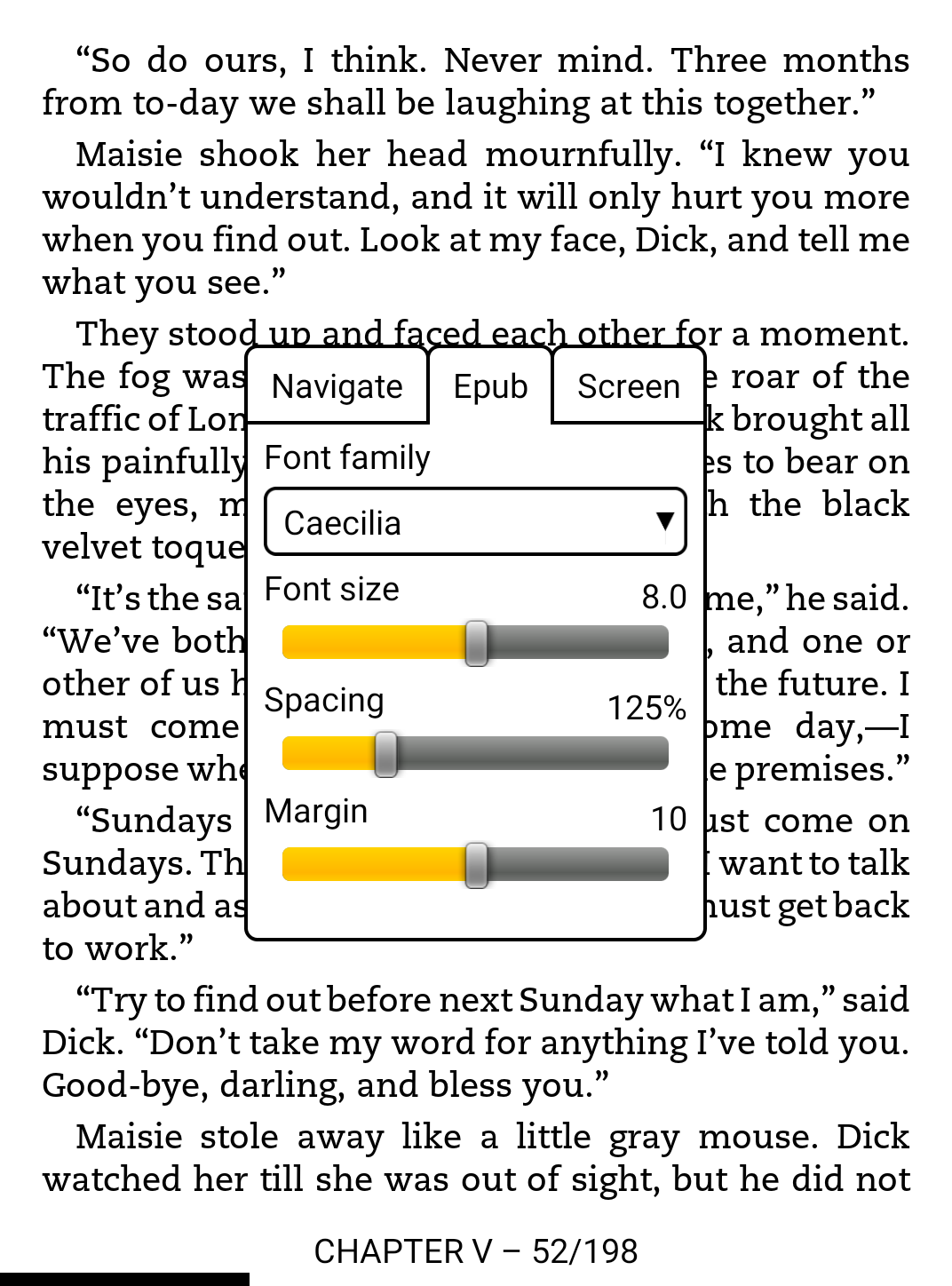 This is my Poke3 with custom reader and the Epub config dialog up.