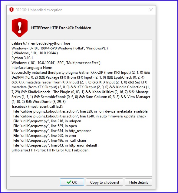 OP: I'm not sure where to report this. But, I just connected my Kobo Sage to Calibre and up popped the following error: Code: