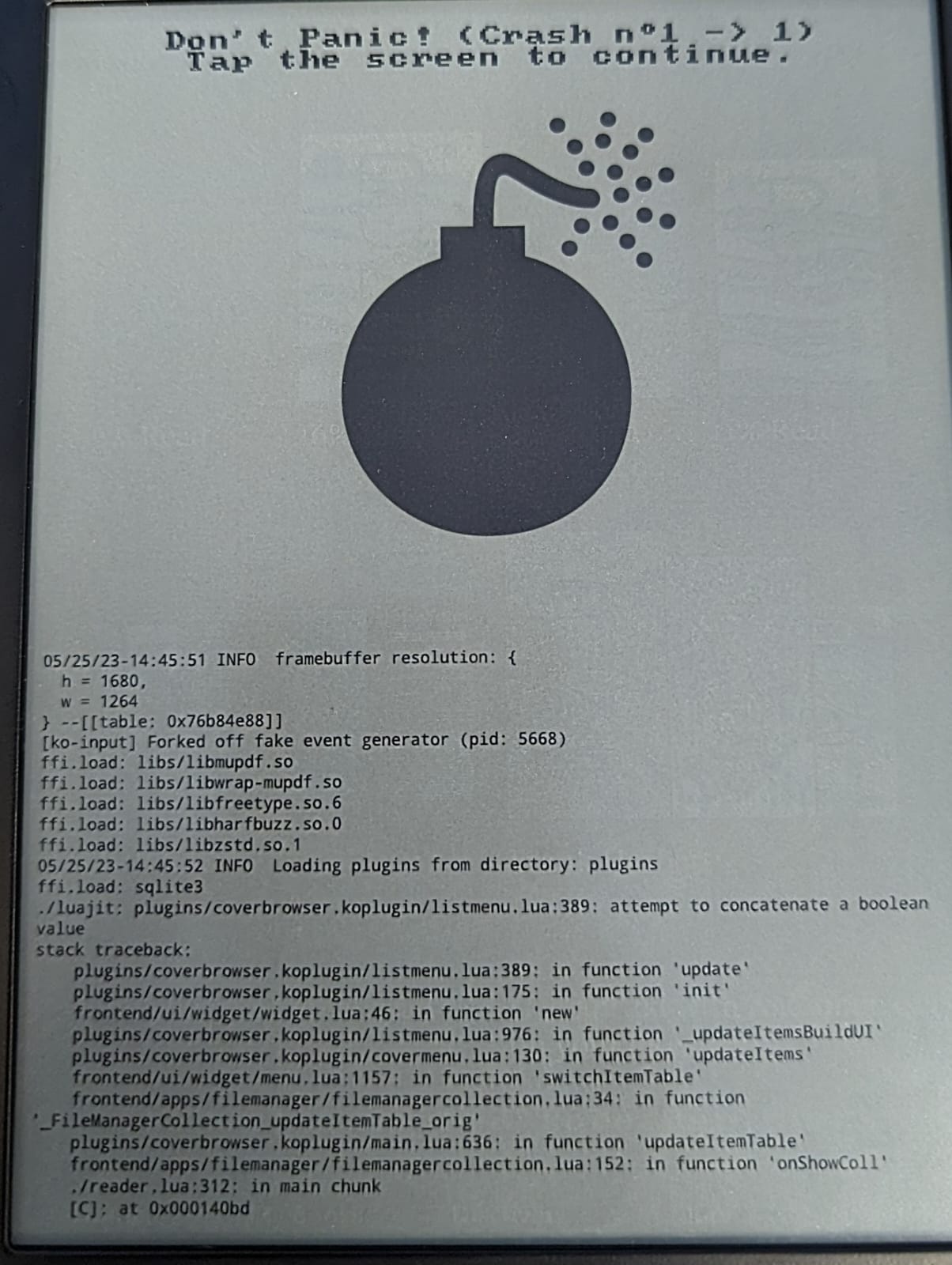 After connecting my Kobo Libra 2 to my computer and transfering a book through Calibre (as I had done several times before), Koreader crashed and I can't make it work again. I tried to reinstall it through the one-click app, but with no luck. Attached is the image of the error. If there was a way to correct this without losing my koreader metadata, I'd really appreciate it! Thanks, |