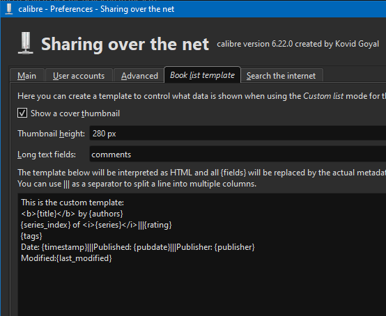 I know somehow I found the one that affected what's displayed when via the content server. However, I can't find it now! So, specifically, how do I access via the Calibre program which metadata fields will display when viewing a book via the content server? I need to add my Last Modified field to this view.. It's checked off in the 3 locations I mentioned, but it doesn't show on the content server book details. |