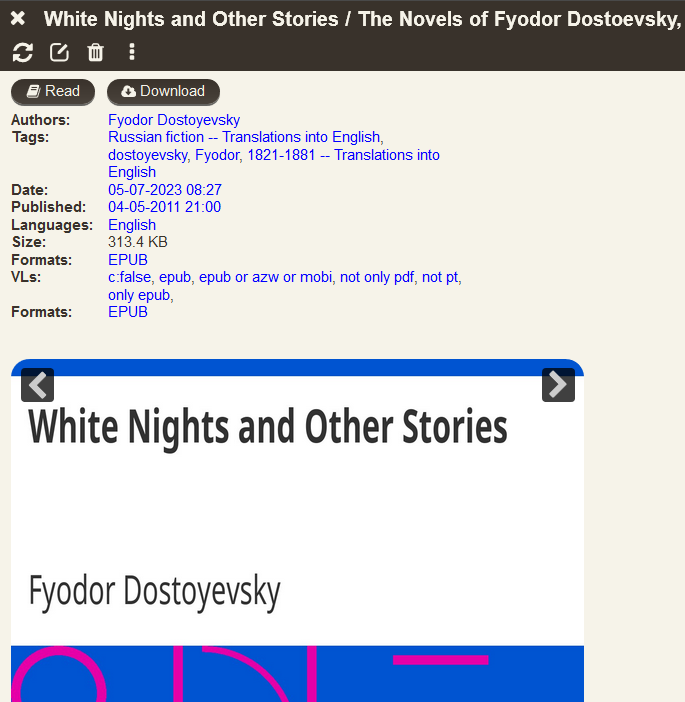 It's not working for me. Modified Date: This is checked off in book details to display Prefs/Look/Bk Details.... as well as the menu via the Configure option bottom right on a details pop-up window. It does display in the software book details at right. It does display in the book details pop-up. It does display in the book details pop-up that can be applied as a link to a tag (although this pop-up isn't quite the same as the customized details or 2nd detals pop-up which has its own configure). It is NOT displaying in the content server details feed. Example: Software Book details wdw at right: Published: 2023 Jul 01 Modified: 2023 Jul 08 Size: 1.45 MB Count:Authors: 4 Server: Published: 2023 Jul 01 Size: 1.4 MB Count:Authors: 4, At first I thought maybe it wouldn't show if there wasn't an actual format attached, but it doesn't show on those entries either. Everything else shows. Of note, I use the Custom List to display book upon signing-in to the library. I use the modified date there, and it shows with no problem. However, I need it to also show in the details. Last edited by jecilop; 07-08-2023 at 02:03 PM. Reason: clarification |