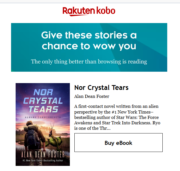 I occasionally get them after looking at an eBook on the store - occasionally it's a helpful reminder to wishlist them. But in this case: a) I already own the book on the Kobo store. b) It's no longer available in Canada, so I couldn't buy it again if I wanted to.