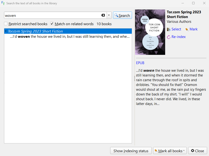 My preference is to use FTS to locate books and then use the e-book viewer to open and search within the book. Since FTS will take multiple search items with various options, perhaps a bit of work on creating searches would be a useful application of your time. See SQLite FTS5 Extension on the SQLite site for more information. See attached images. Last edited by DNSB; 07-24-2023 at 06:00 PM. |