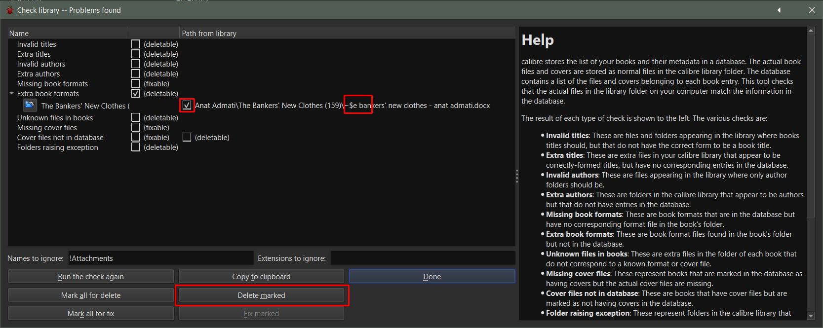 )) Each one opened. All items checked off. Then clicked Mark for Fix. Clicked Done. Went into the main library view. Tried to Toggle Marked Books. No books are marked. When books are Marked in Calibre, they are Marked with a PushPin. The only thing that it appears you can do in Mark for Fix is to do an Automatic Fix from within the menu. I don't want automatic fixes, I simply wanted those books to be marked so I could attend to them from within the main screen. But whatever "marking" is done inside the Check Library tool doesn't seem to carry over into the regular library view mode. |