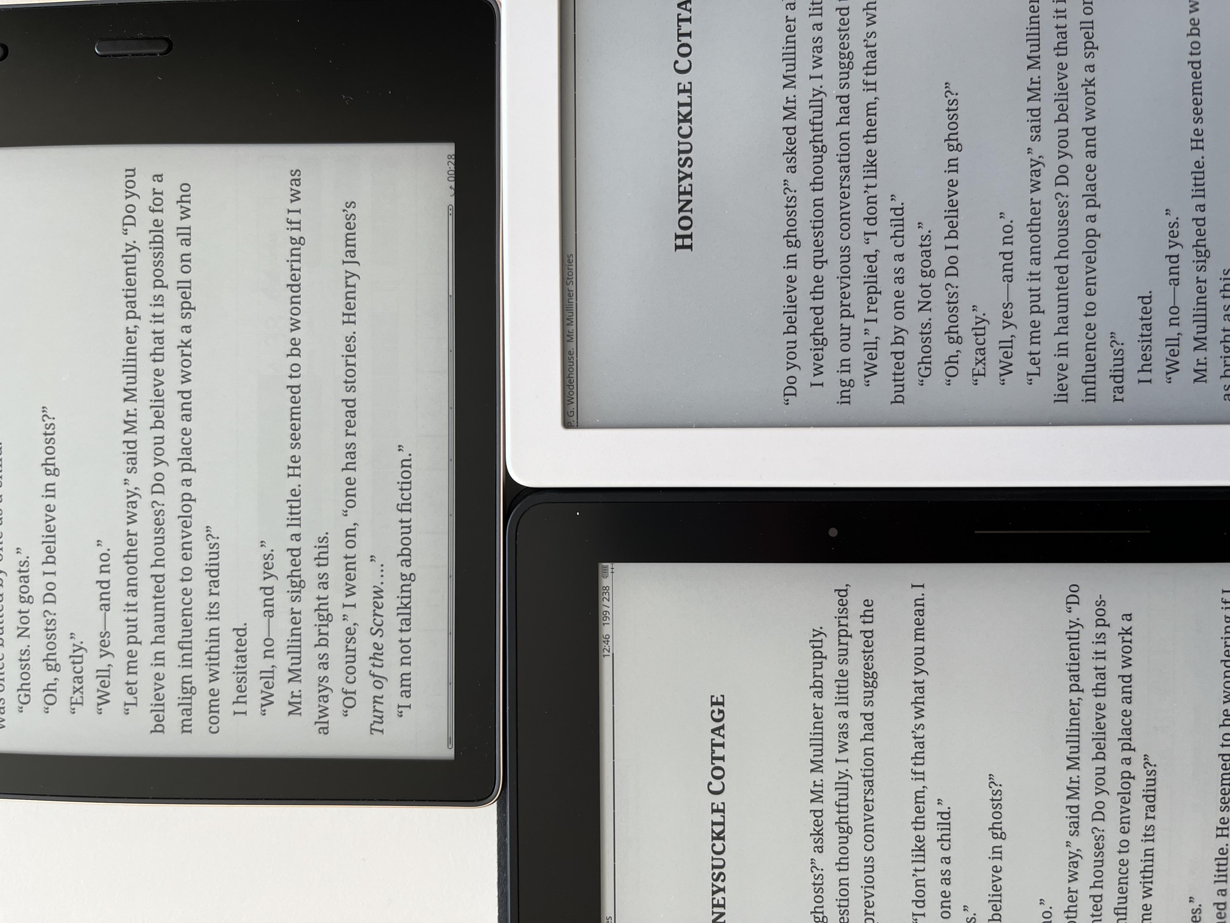 The Libra 2 and Leaf 2 have darker text than the Voyage, but also darker background, so overall slightly worse contrast. The sharpest text that I've seen is still on the white Leaf 2, which is slightly better than the Libra 2 when comparing screens. The Libra 2 deals with reflections better than the Leaf 2, so I think it's a trade off. All this is with the frontlight off. I almost never read with the frontlight on. |