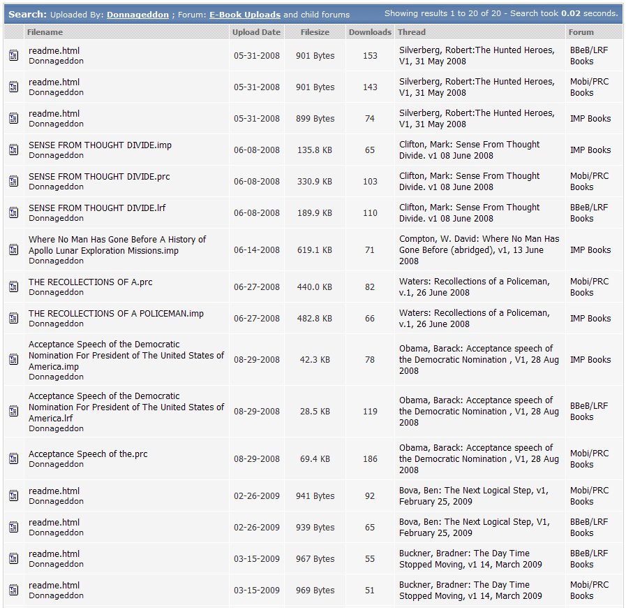![]() Well, ever wonder what these Top Uploaders uploaded in the early years of their ebook creation "careers"? Well wonder no longer as I present to you, the Top Uploaders' Early Ebook Uploads (Rank 01 to 18) in glorious picture form (and list form): Code: