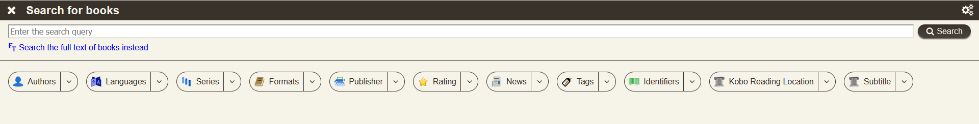 The search field allows the exact same syntax as searching in calibre https://manual.calibre-ebook.com/gui...arch-interface