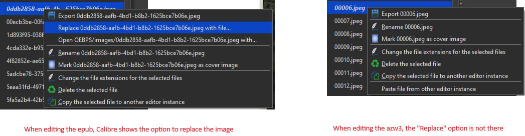 ![]() I converted the file to AZW3 and tried to replace the file, but the "Replace" option in Calibre is missing. (See screenshot.) |