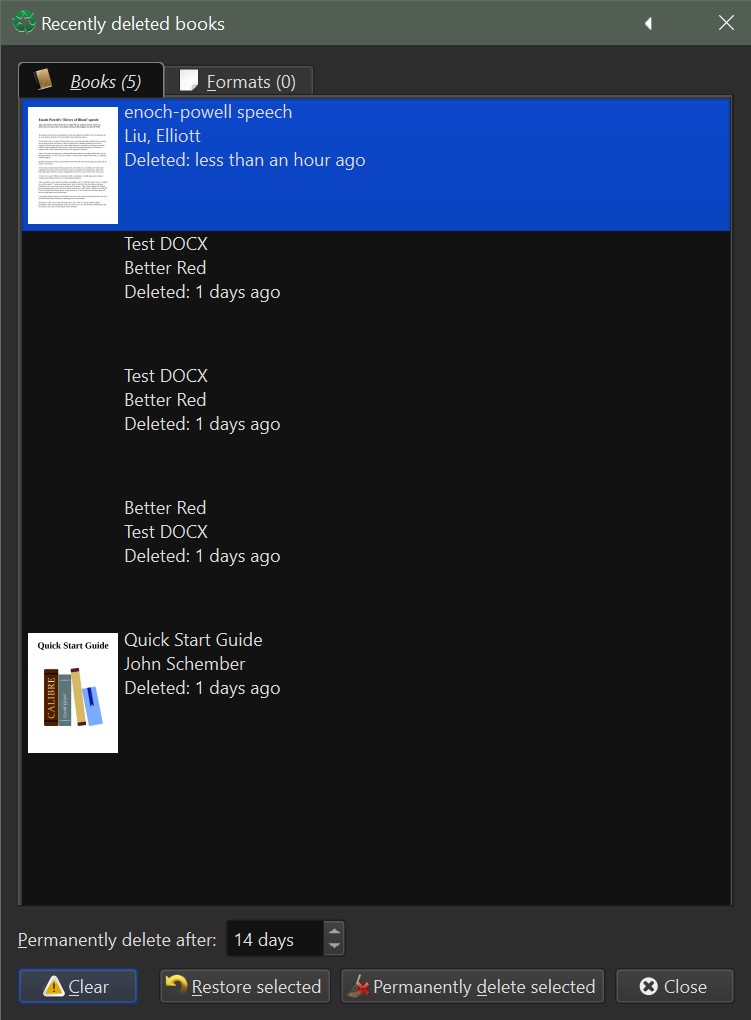 I tried duplicating an existing book, then deleting the duplicate, and I'm still not seeing that option. The old solution, for all its flaws, made it possible to restore accidentally-deleted files and retype the metadata, this does not. I am on Calibre 5.44.0. I cannot use Calibre 6 on this system. P.S. Now they're showing up in the system trash. Not sure why they weren't before. Last edited by MarjaE; 08-29-2023 at 04:51 PM. |