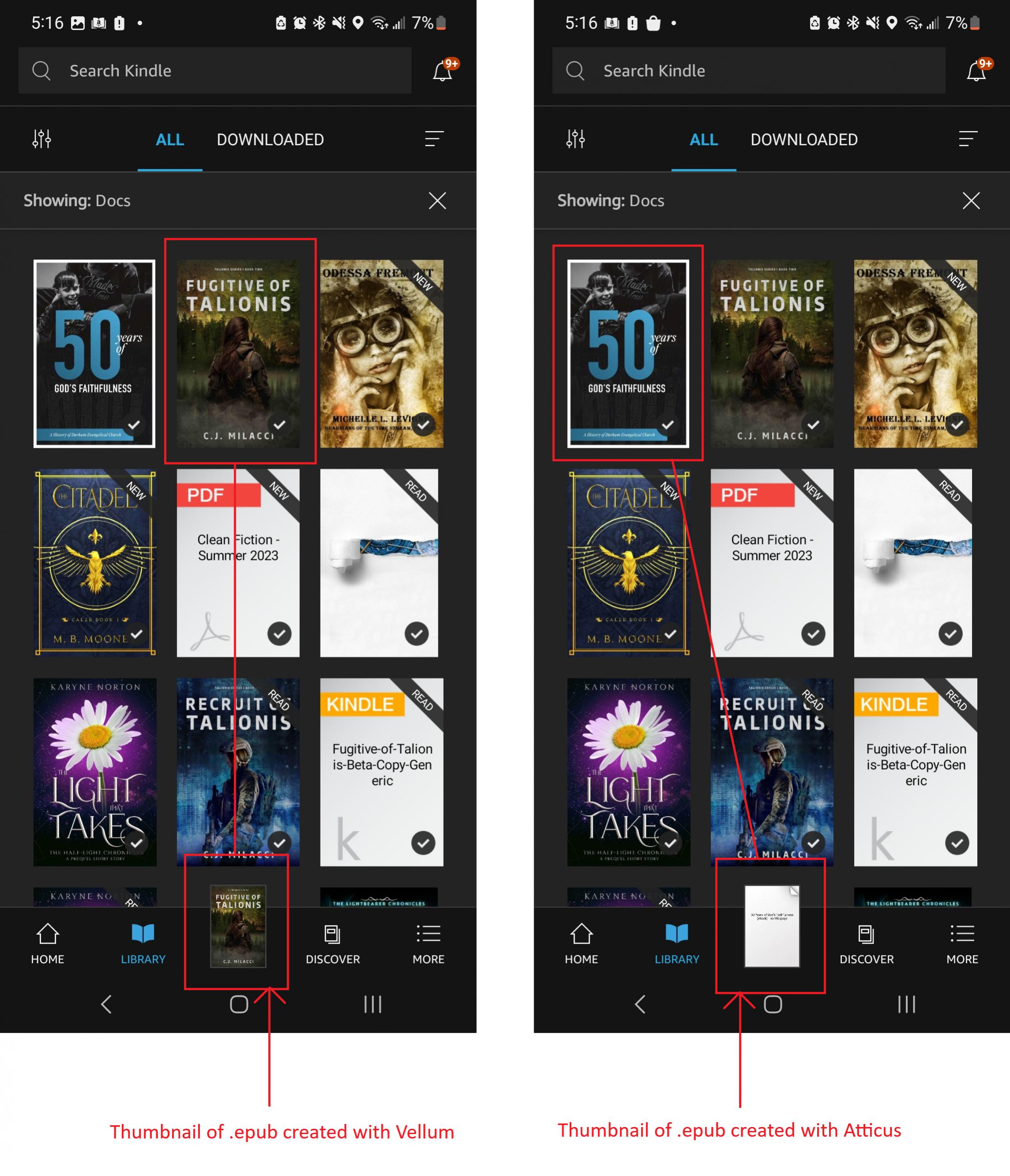 Both books were side-loaded, and my intention is that my book will always be side-loaded. My epub was generated by Atticus. My friend's was generated by Vellum. I compared the epubs and tried some things, including: