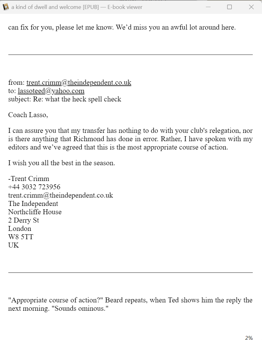 <blockquote class="userstuff"> <hr/><p>from: <a href="/cdn-cgi/l/email-protection" class="__cf_email__" data-cfemail="3e4a4c5b504a105d4c5753537e4a565b57505a5b4e5b505a5b504a105d51104b55">[email*protected]</a><br/>to: <a href="/cdn-cgi/l/email-protection" class="__cf_email__" data-cfemail="ee828f9d9d819a8b8b8aae978f868181c08d8183">[email*protected]</a><br/>subject: Re: what the heck spell check</p><p>Coach Lasso,</p><p>I can assure you that my transfer has nothing to do with your club's relegation, nor is there anything that Richmond has done in error. Rather, I have spoken with my editors and we’ve agreed that this is the most appropriate course of action.</p><p>I wish you all the best in the season.<br/> <br/>-Trent Crimm<br/>+44 3032 723956<br/><a href="/cdn-cgi/l/email-protection" class="__cf_email__" data-cfemail="136761767d673d70617a7e7e53677b767a7d777663767d77767d673d707c3d6678">[email*protected]</a><br/>The Independent<br/>Northcliffe House<br/>2 Derry St<br/>London<br/>W8 5TT<br/>UK</p><hr/> </blockquote> Weirdly, the ones in the body are also protected. I suspect there's some slightly different processing going on there. Last edited by ownedbycats; 09-01-2023 at 11:05 PM. |