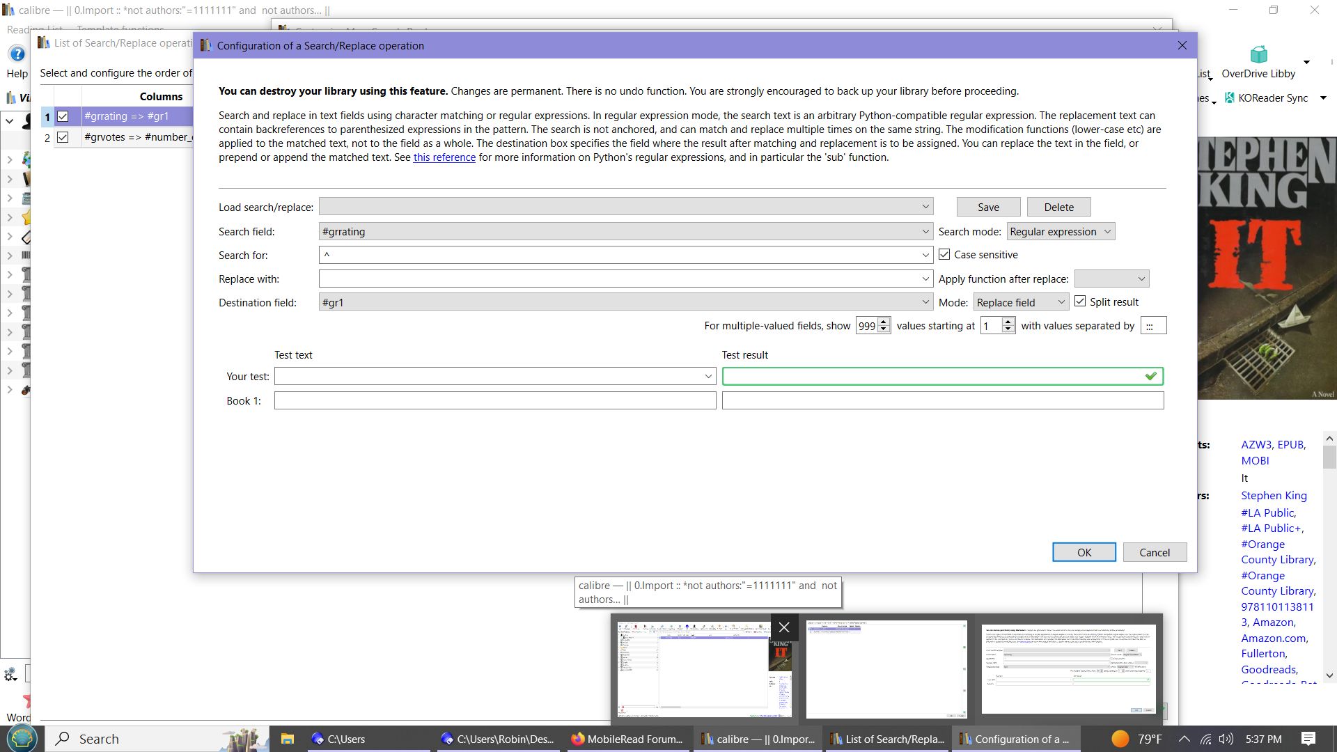 Now you should have the "Mass Search and Replace" plugin installed. If you do, then create a new set of rules for moving the numbers from the composite columns (the ones filled in by the plugin) to the new ones. Two rules, one for each column. Give it a name like “GR Ratings/Votes” and basically only run it when you know you have the numbers.