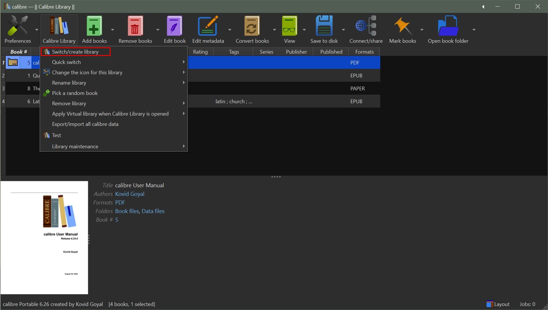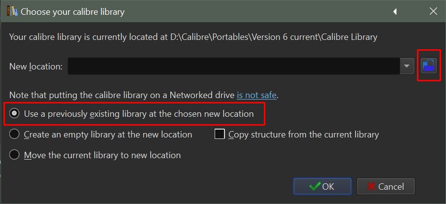 Two - that will pop this dialogue box Three - click the blue folder button and browse to folder in which you found the metadata.db file - don't open the folder - select the folder and click Select Folder. That will take you back to the calibre popup dialogue box. Before clicking OK in the calibre popup make sure the "Use a previously existing library…" radio button is selected. You should be able to switch to that library. Where is the library? BR Last edited by BetterRed; 09-17-2023 at 01:39 AM. |